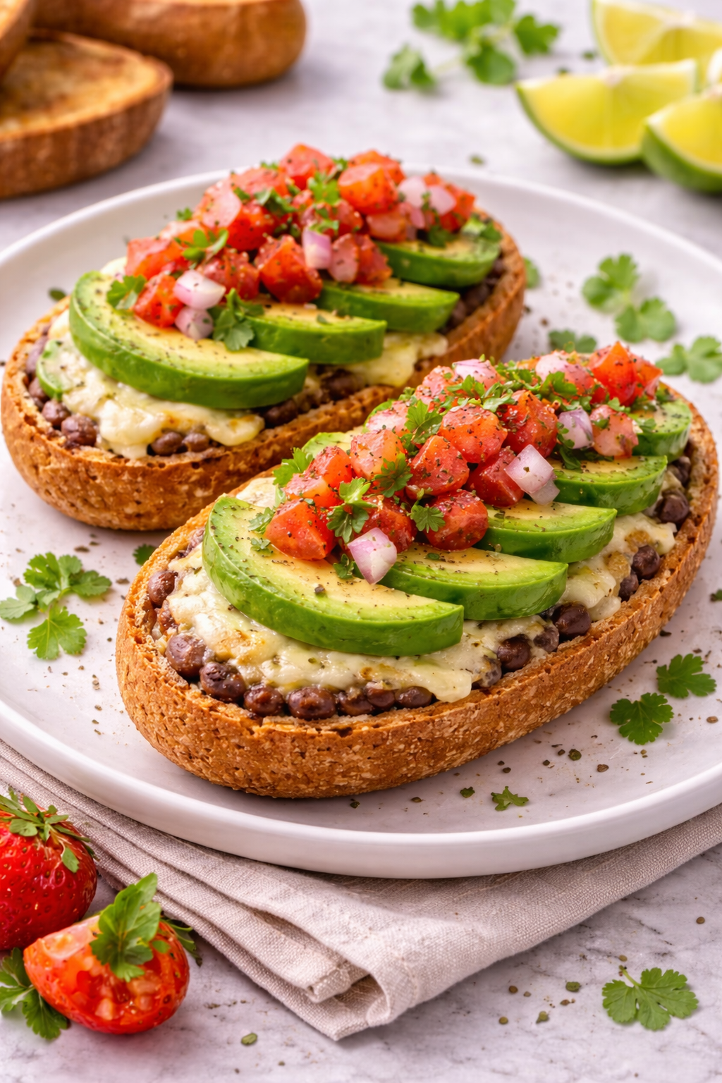 Una versión saludable y deliciosa del clásico desayuno mexicano. Estos molletes integrales combinan pan crujiente, frijoles refritos, queso derretido y una capa generosa de aguacate fresco, coronados con pico de gallo. Son perfectos para un desayuno completo, lleno de energía y sabor. Ideales para comenzar el día con algo nutritivo, práctico y muy mexicano.