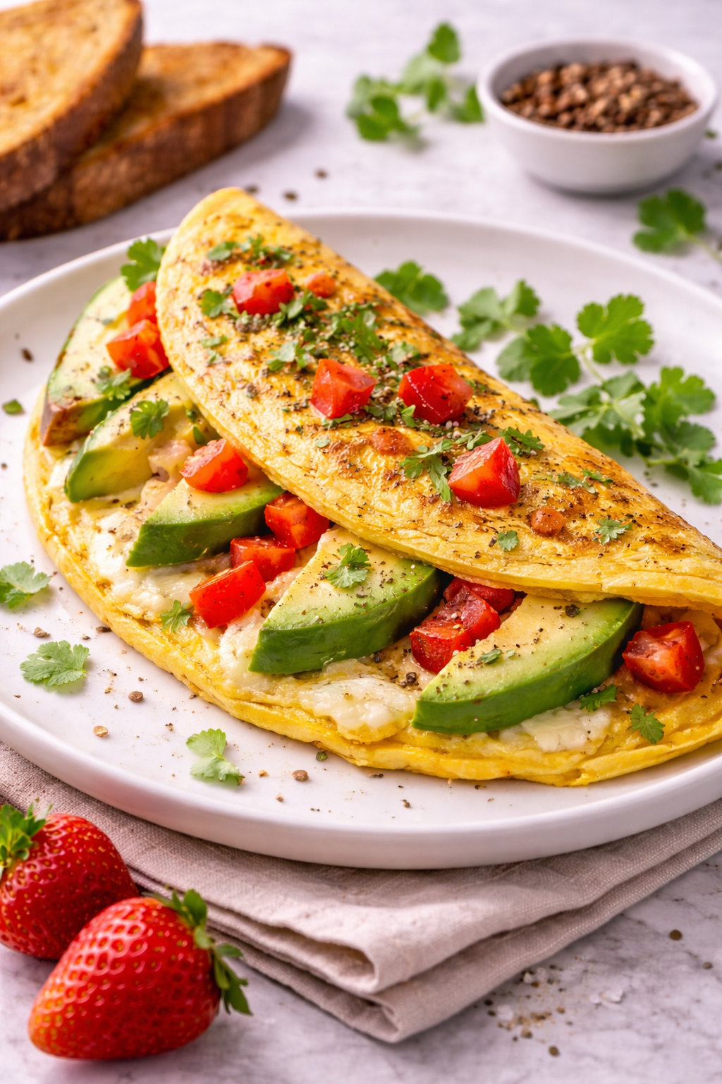Un desayuno completo, rápido y muy nutritivo donde el aguacate aporta cremosidad natural al omelette. La combinación de huevo esponjoso, queso derretido y aguacate fresco crea un platillo reconfortante, ideal para empezar el día con energía. Es perfecto para un desayuno casero saludable o un brunch ligero, con una textura suave y un sabor equilibrado que se prepara en pocos minutos.